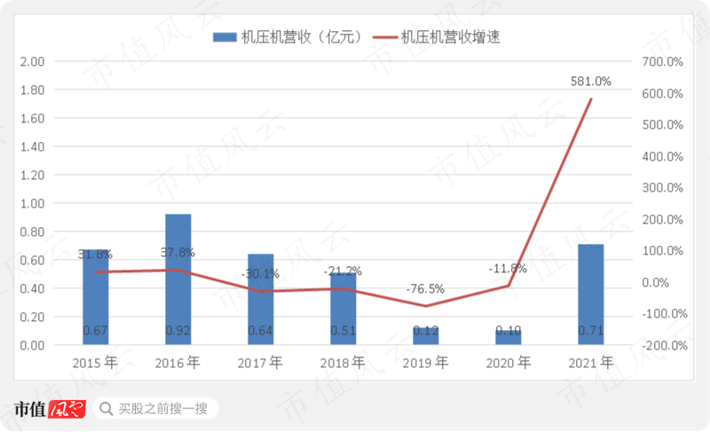 机压机主要应用于汽车行业,2021年出现了爆发式增长,不过当前营收规模仍较低。