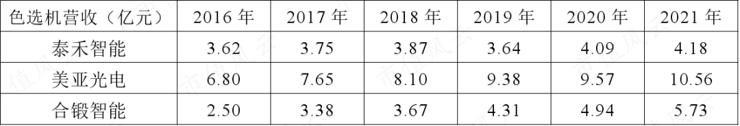 对比同行,目前色选机营收规模最大的为美亚光电,其次为合锻智能,整体规模都不高。