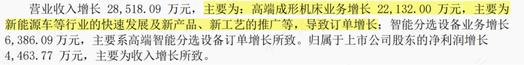 结合上文液压机和色选机的营收增速,公司业绩增长主要来自于机床业务,受新能源车等行业的快速发展及新产品、新工艺的推广等影响,相关订单出现大幅增长。