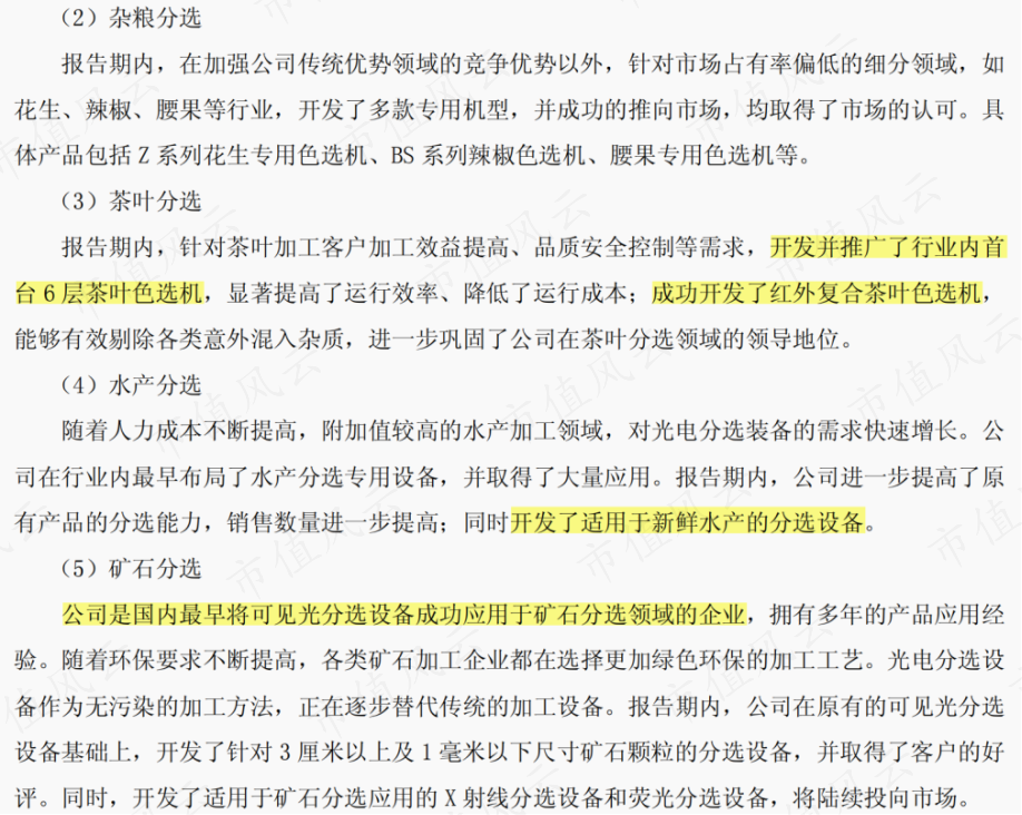 应用领域包括大米、杂粮、茶叶色选等传统领域外,还包括矿石、水产、果蔬、固体废弃物、煤炭等新兴领域,业务主体为2015年收购的全资子公司安徽中科光电色选机械有限公司(下称中科光电)。