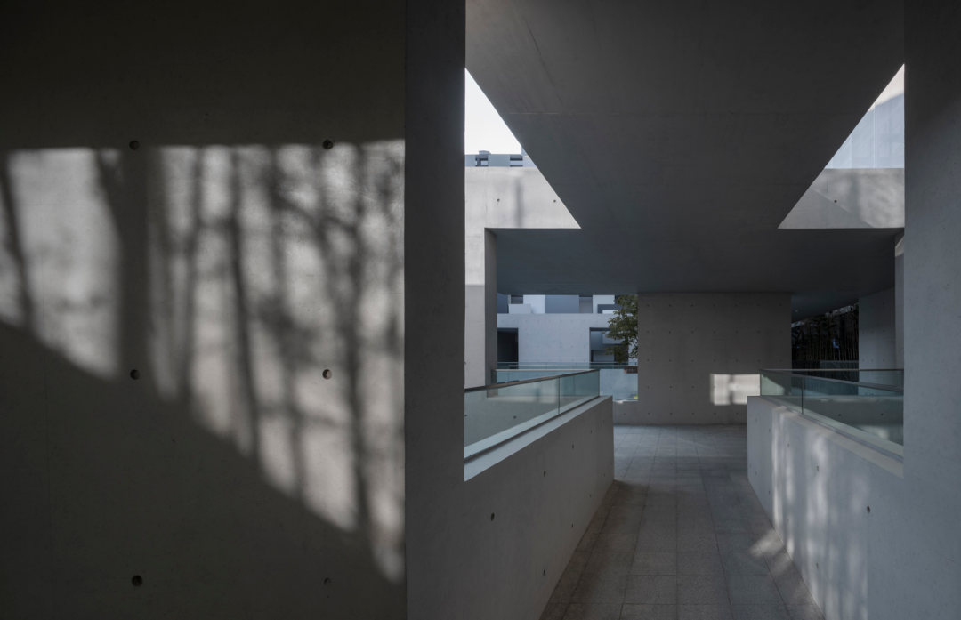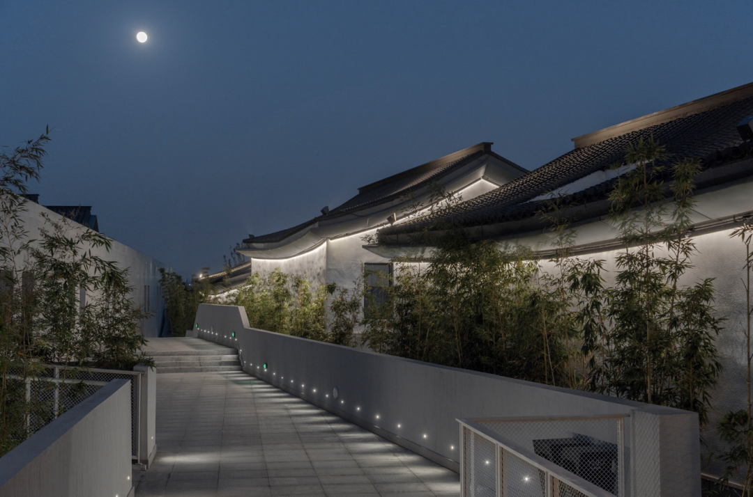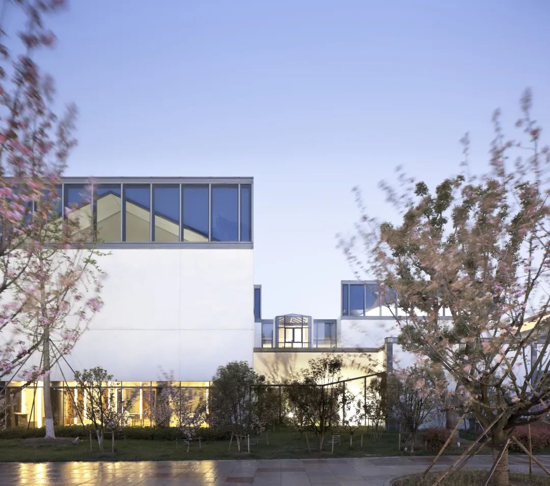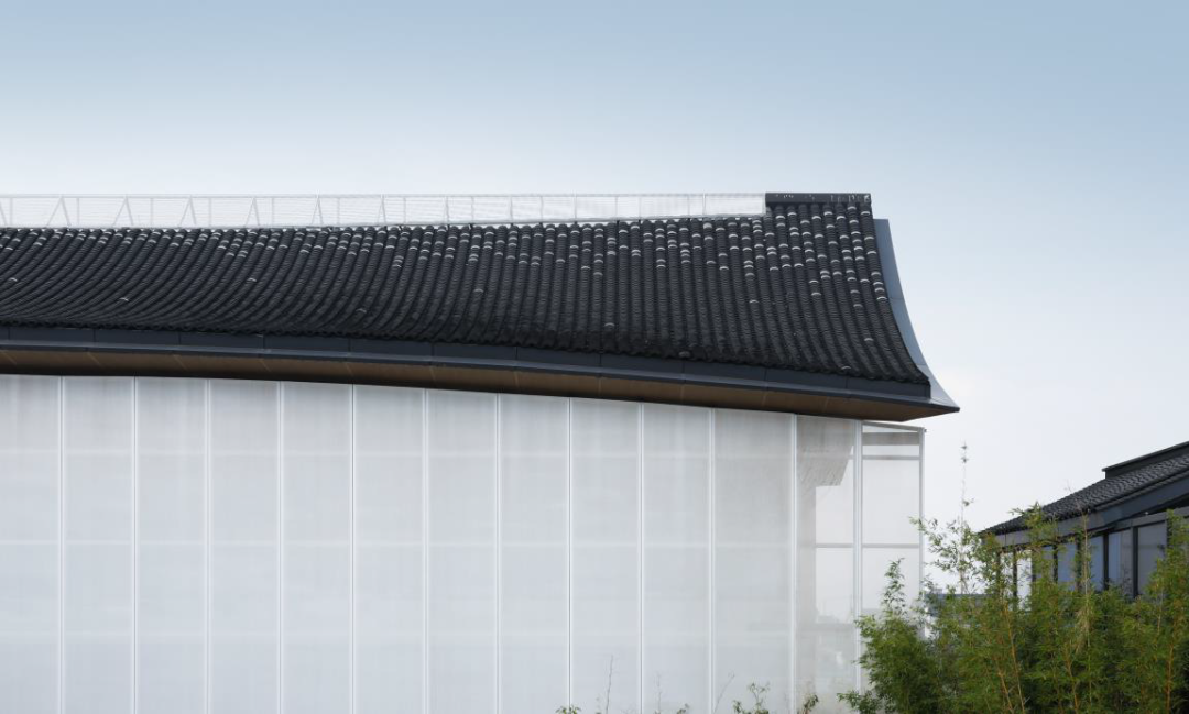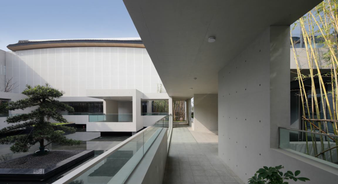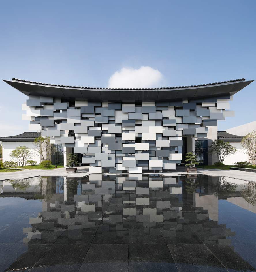 建筑形态以苏州传统建筑“粉墙黛瓦”为意象,透过新材料及独特的组合方式,对当代苏式建筑意境进行重新演绎。入口处的灰白片状铝板以水墨渲染之意境勾勒出照壁形态,并与水院假山形成巧妙的首尾呼应关系。内院采用织物幕墙模拟传统粉墙,实现遮光、透影的效果,形似幔帐垂帘,趣味盎然。清水混凝土以游廊及亭阁的姿态浮于水院之上,与粉墙、假山形成对比,成功地展现了传统与现代的融合之美,为建筑注入了时代活力。