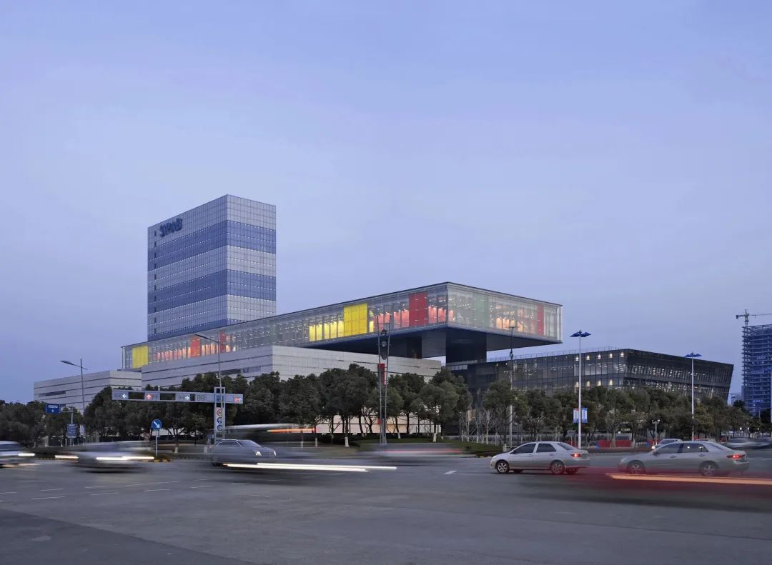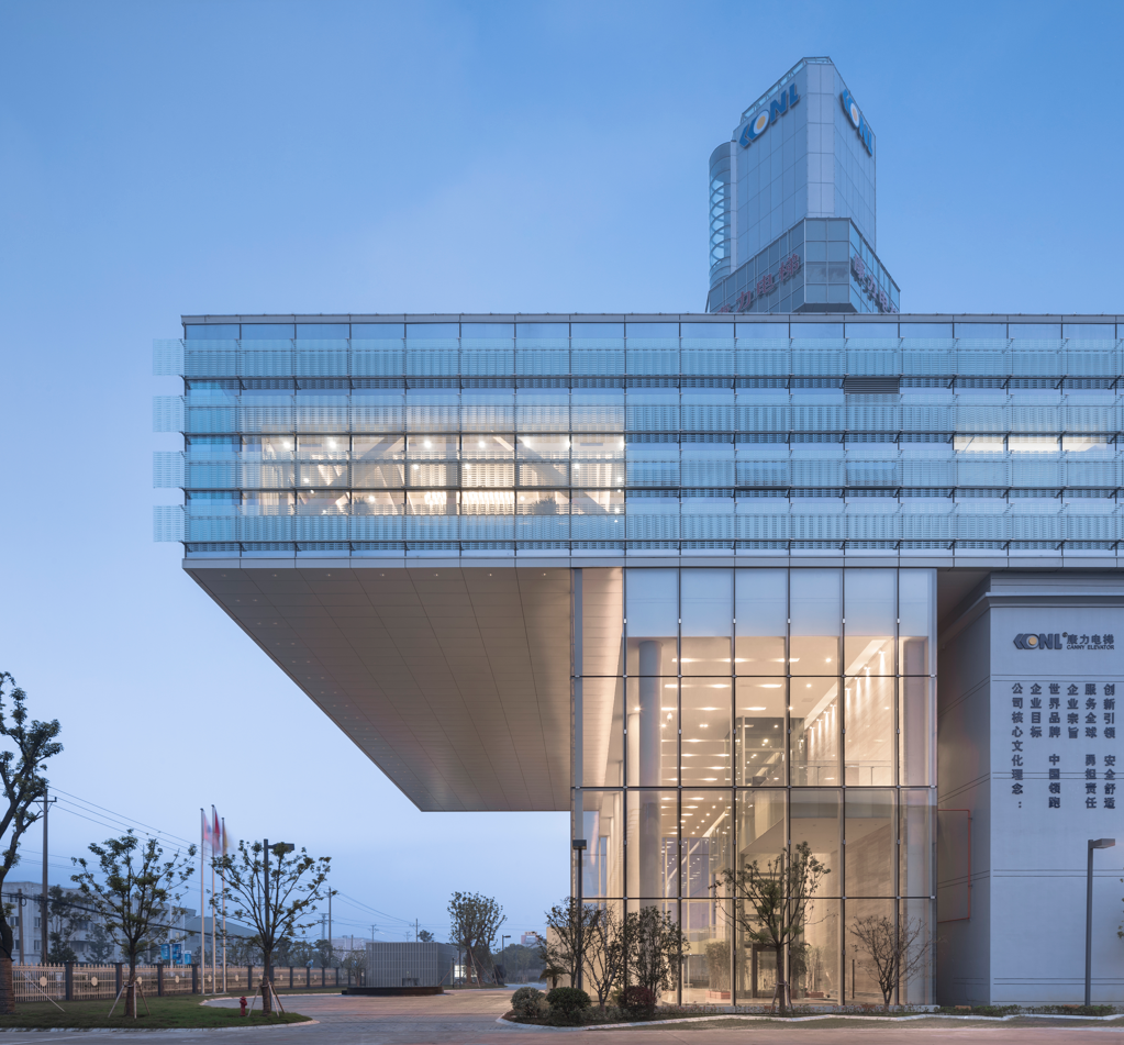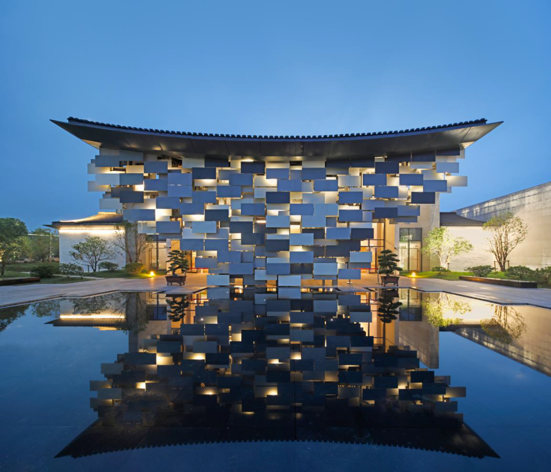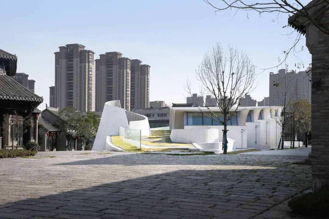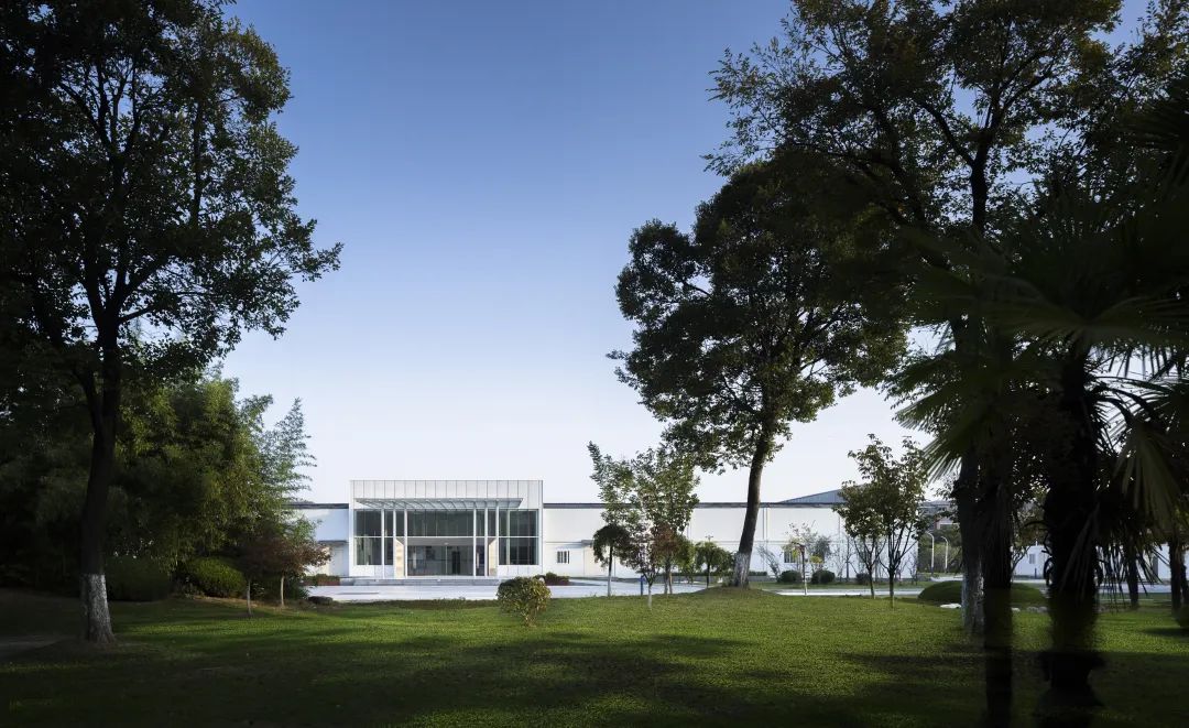 建筑形态以苏州传统建筑“粉墙黛瓦”为意象,透过新材料及独特的组合方式,对当代苏式建筑意境进行重新演绎。入口处的灰白片状铝板以水墨渲染之意境勾勒出照壁形态,并与水院假山形成巧妙的首尾呼应关系。内院采用织物幕墙模拟传统粉墙,实现遮光、透影的效果,形似幔帐垂帘,趣味盎然。清水混凝土以游廊及亭阁的姿态浮于水院之上,与粉墙、假山形成对比,成功地展现了传统与现代的融合之美,为建筑注入了时代活力。