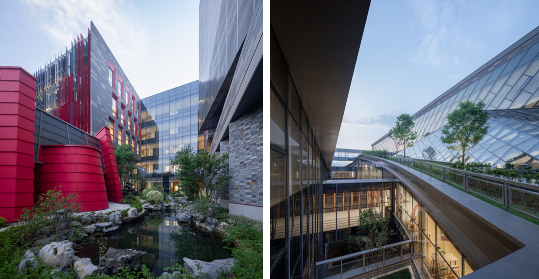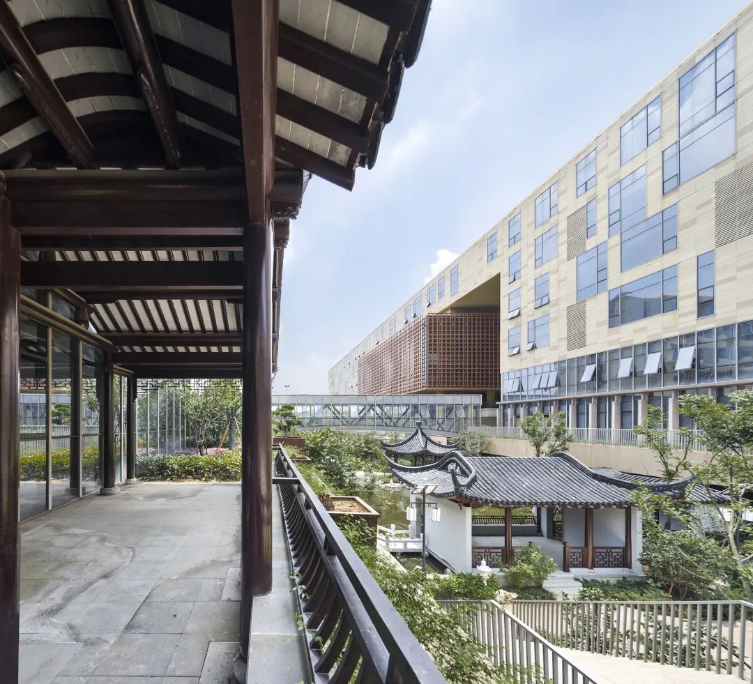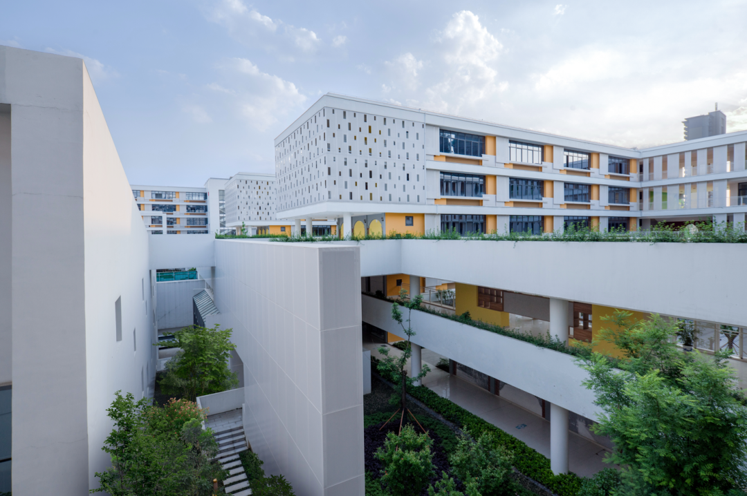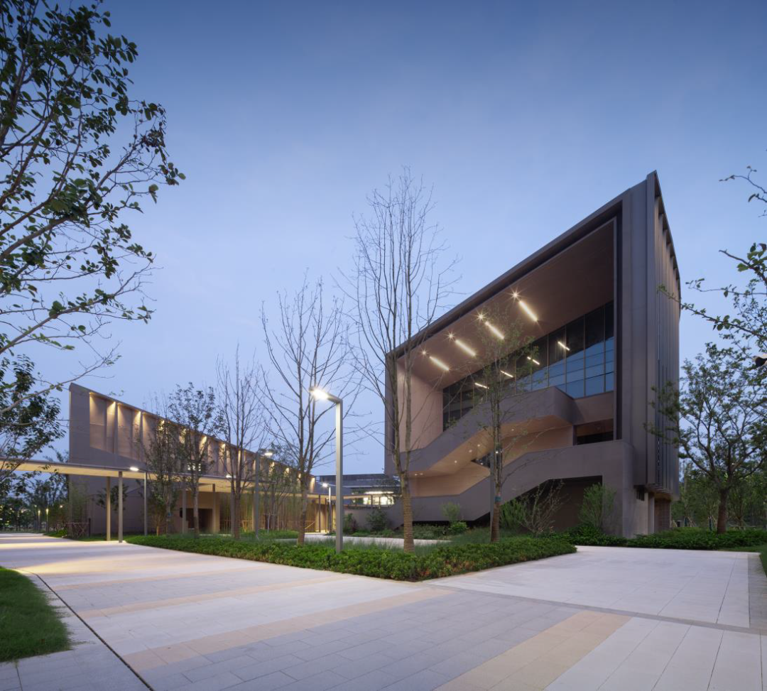 教学行政综合体设计着重于建筑与自然的互动,基于总体规划通过空间布局设置了七座院落,实现内外空间的和谐。内部集成服务、交流、学习功能,优化教学空间流线;外部则形成了一至三层屋顶花园和半山绿坡,引入自然光和绿植,创造宜人的教学环境。