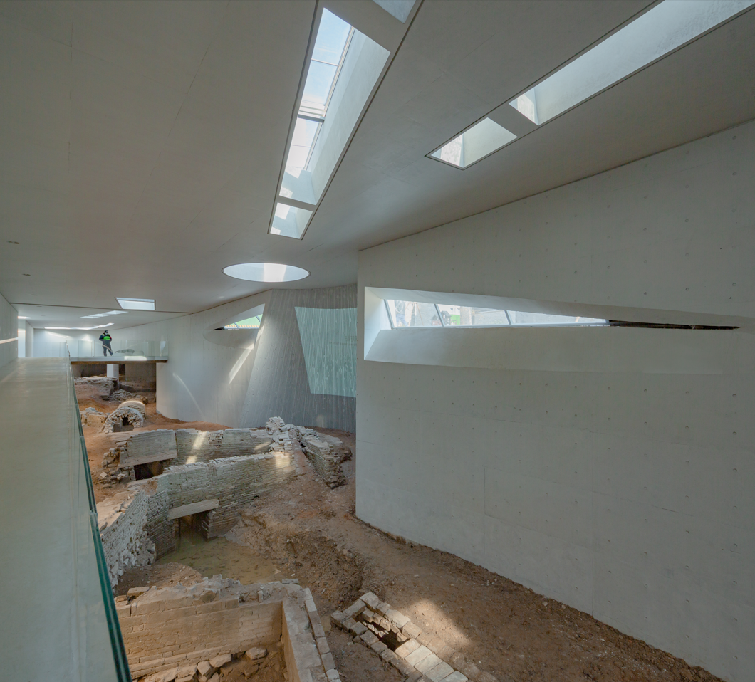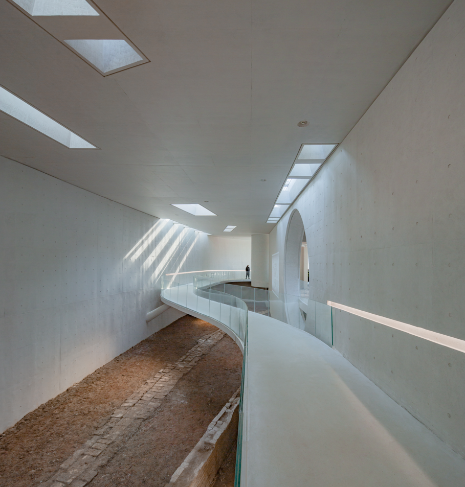 在建筑形式上,宿迁古渠遗址博物馆采用清水混凝土浇筑的半拱,对古渠筒拱的形制进行几何转译,展现博物馆的当代性与延续性。水纹玻璃砖在墙面上组成“拱”的“符号”,再次呼应水渠。天窗采用至上主义构图,顺应屋面之下古渠的走向,引发人们对历史、对当代的真实思考。