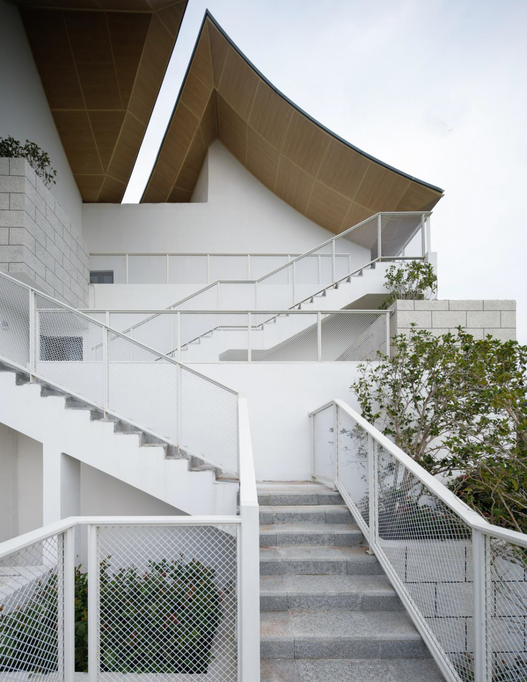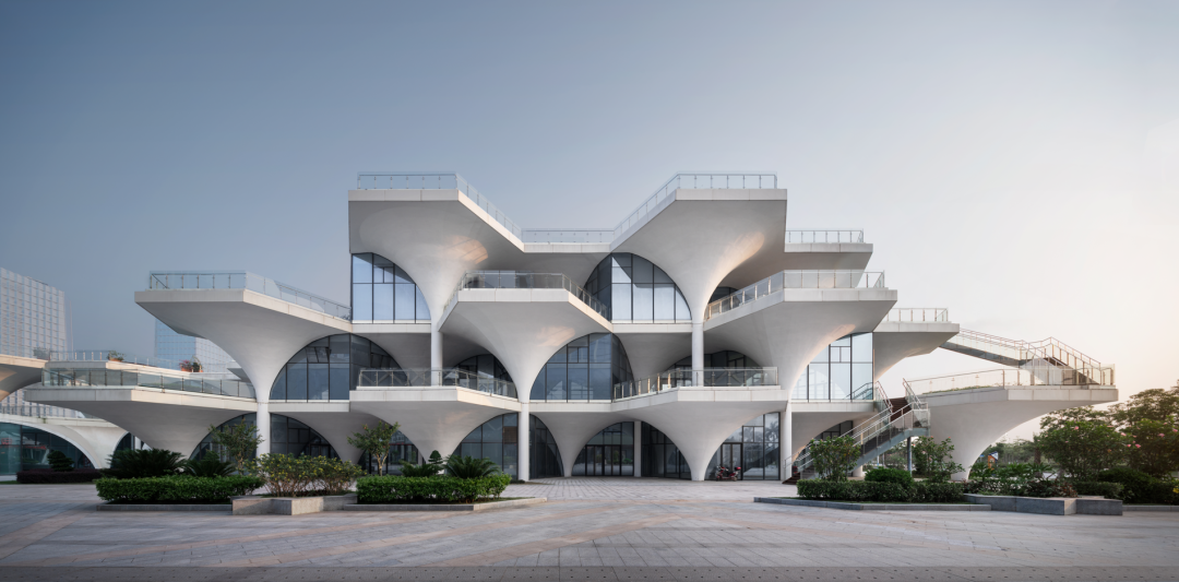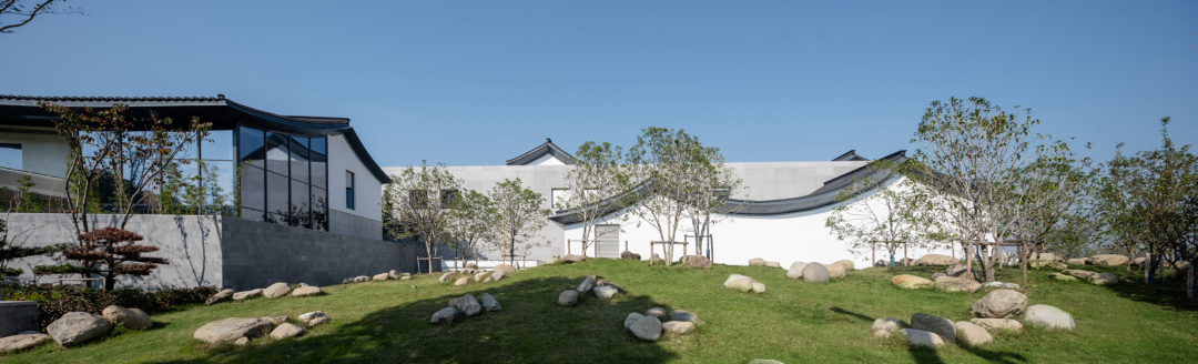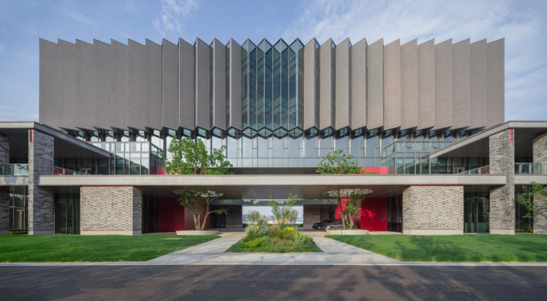设计团队巧妙利用基地四边界的鲜明特点,打造建筑的在地属性:东侧主入口通过架空底层引入山景,以水景、草坪、柱廊等元素营造富有文化和历史感的广场;西侧接山,建筑首层曲线轮廓与山体趋势呼应,屋顶花园和观山阳台逐级后退,打造立体观山效果;东侧泮水,内部空间通过材质的搭配营造虚实变化,并通过庭院和长廊引水入室;南侧靠近校园运动区,设计采用地景化的方式处理南侧建筑形态。最终四界相合,呈现合与理、合与势、合与意的形态。