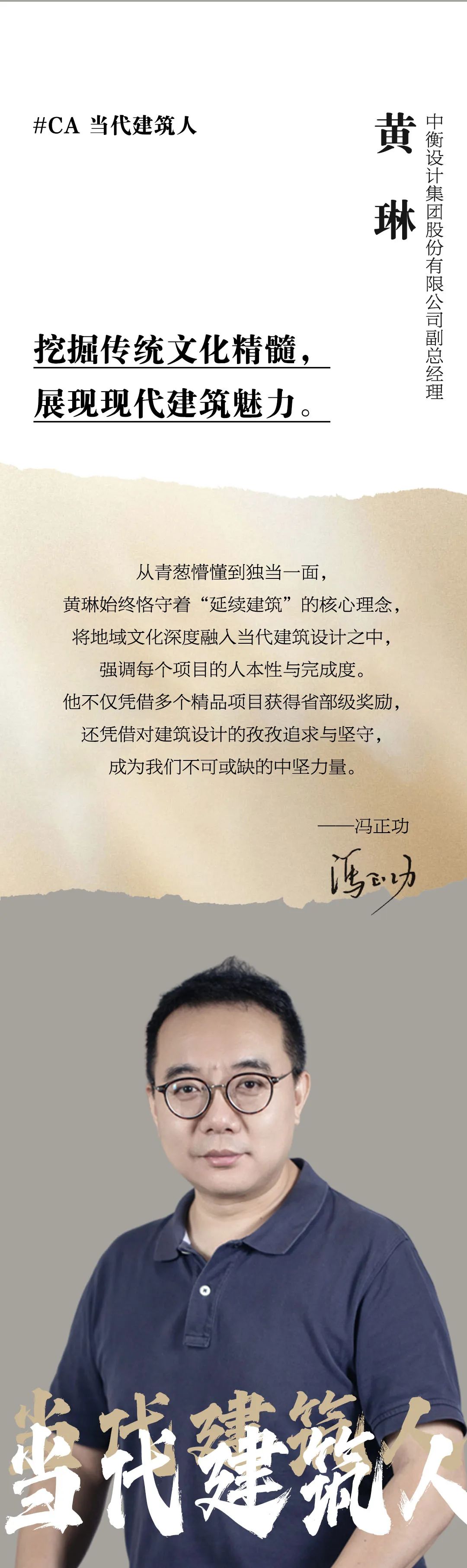 2023年,CA当代建筑隆重推出“当代建筑人”特辑,旨在向业界展示设计机构杰出的建筑师、未来的领导者的瞩目成就。本期“当代建筑人”为中衡设计集团股份有限公司副总经理、建筑创作设计研究院院长黄琳。黄琳自大学毕业入职中衡设计,即加入全国工程勘察设计大师冯正功董事长的“延续建筑”创作中心,并按公司人才培养制度,与冯正功大师结为师徒。在工作中,他还虚心向公司资深建筑师陈良全等专家学习。个人获中国建筑学会青年建筑师奖、江苏省优秀工程勘察设计师等荣誉称号。个人与团队一起,主要完成了南京大学苏州校区、苏州大学未来校区、中衡设计集团研发中心大楼、苏州工业园区档案管理中心大厦、绵竹市体育中心、苏州国际会议酒店、吴江东太湖温泉旅游度假区、宿迁古渠遗址博物馆、王集镇鲤鱼山庄特色田园乡村项目、高铁新城第一中小学等一大批重要项目。