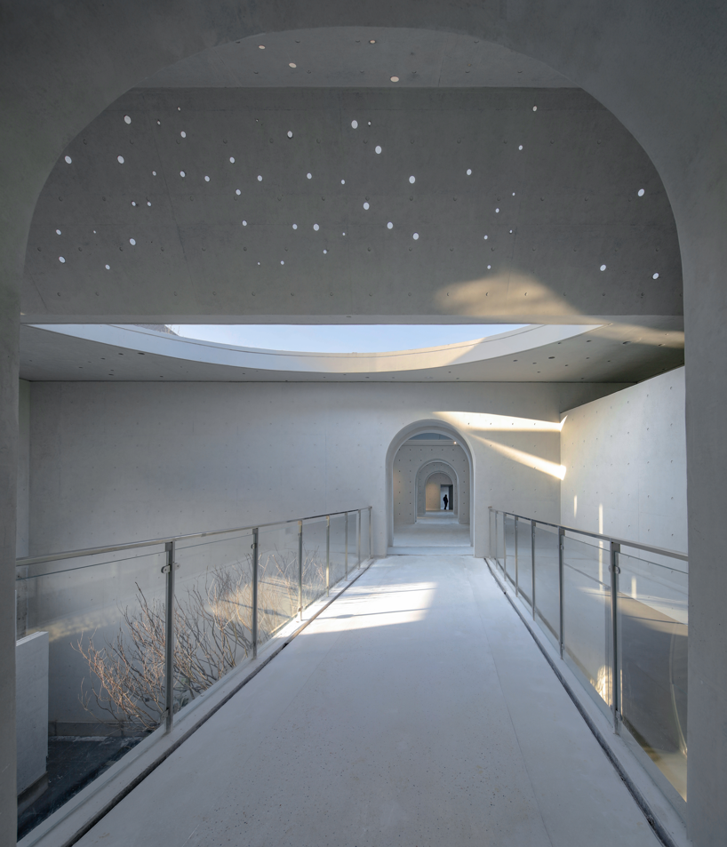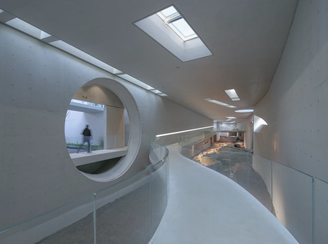 设计通过自然光的渗透暗示时间的存续;利用数学几何表达建筑的当代性,照应古渠遗址的历史;将水面倒影纳入城市的图景。博物馆在古渠遗址与当代艺术的双重身份中定义环境,打破历史与当代的边界,使参观者获得关于时间、空间的感知体验。
