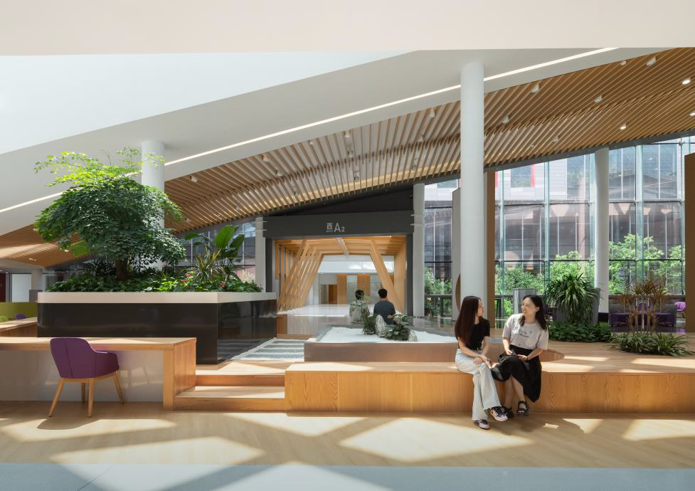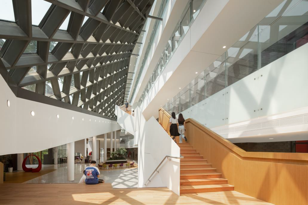 设计从人的体验出发,调度空间节奏,注重收与放、开与合、虚与实的空间关系,设计除了设置了近二十种教室类型外,还塑造了整体而多样的泛在学习空间。使用者获得了游园般的空间体验,于此遇智者,展开交流,进行沉思,碰撞思想。