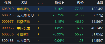 12月3日,中科曙光(603019.SH)午后短线跳水跌超9%。截至收盘,该股下跌7.10%,成交额122.4亿元。云天励飞、中国长城、浪潮信息、中国软件、东方国信等科技股纷纷跟跌。