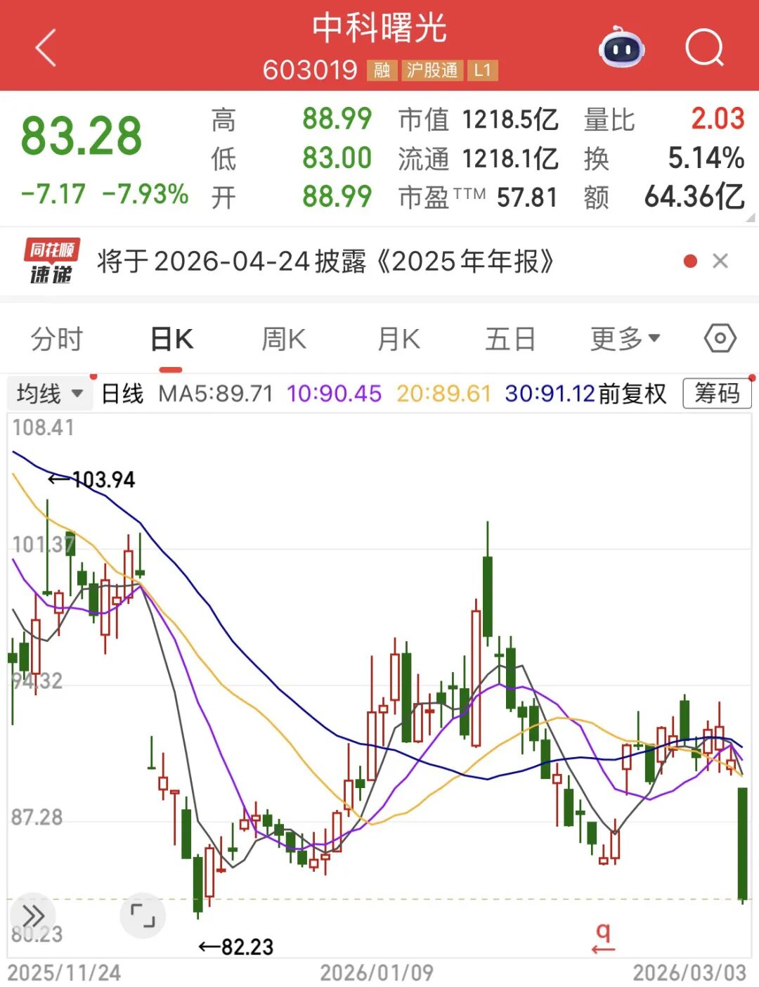 3月3日,国产算力龙头中科曙光(603019)报收83.28元,跌幅近8%,最新市值缩水至1218亿元,单日市值蒸发约105亿元。