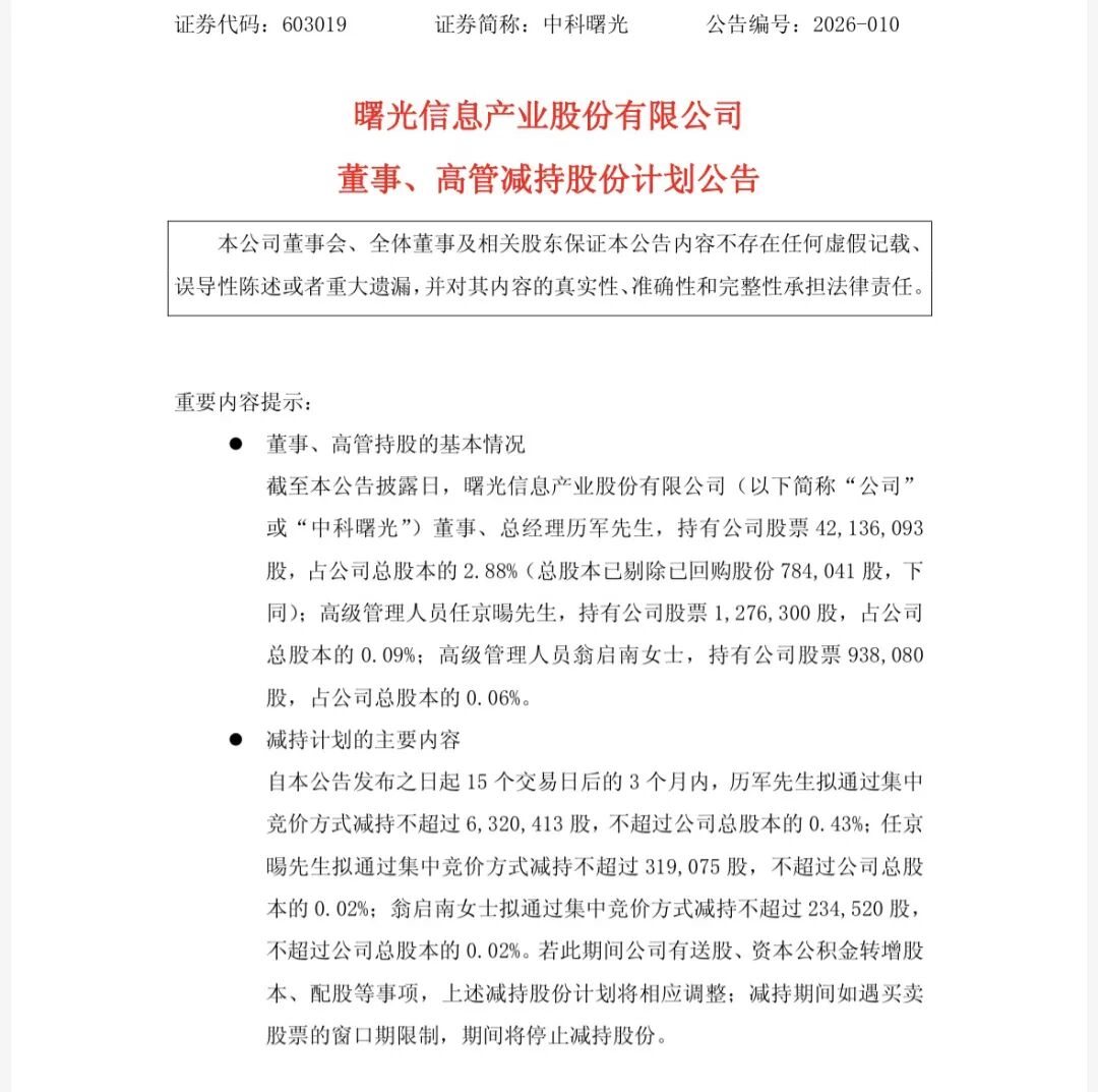 对于本次减持,中科曙光在公告中表示,减持原因为个人资金需求,减持计划存在不确定性,不会对公司治理结构、股权结构及持续经营产生重大影响。