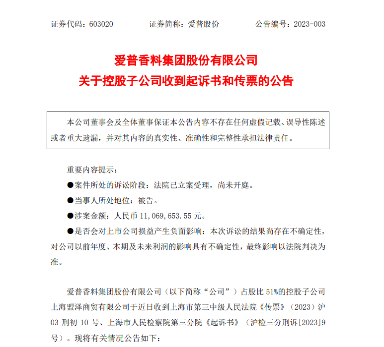 据爱普股份披露,经上海海关缉私局侦查终结,被告单位盟泽商贸涉嫌走私普通货物罪,被告人许广益、戴晓雯涉嫌走私普通货物罪,于2022年12月27日向上海检察院第三分院移送起诉。