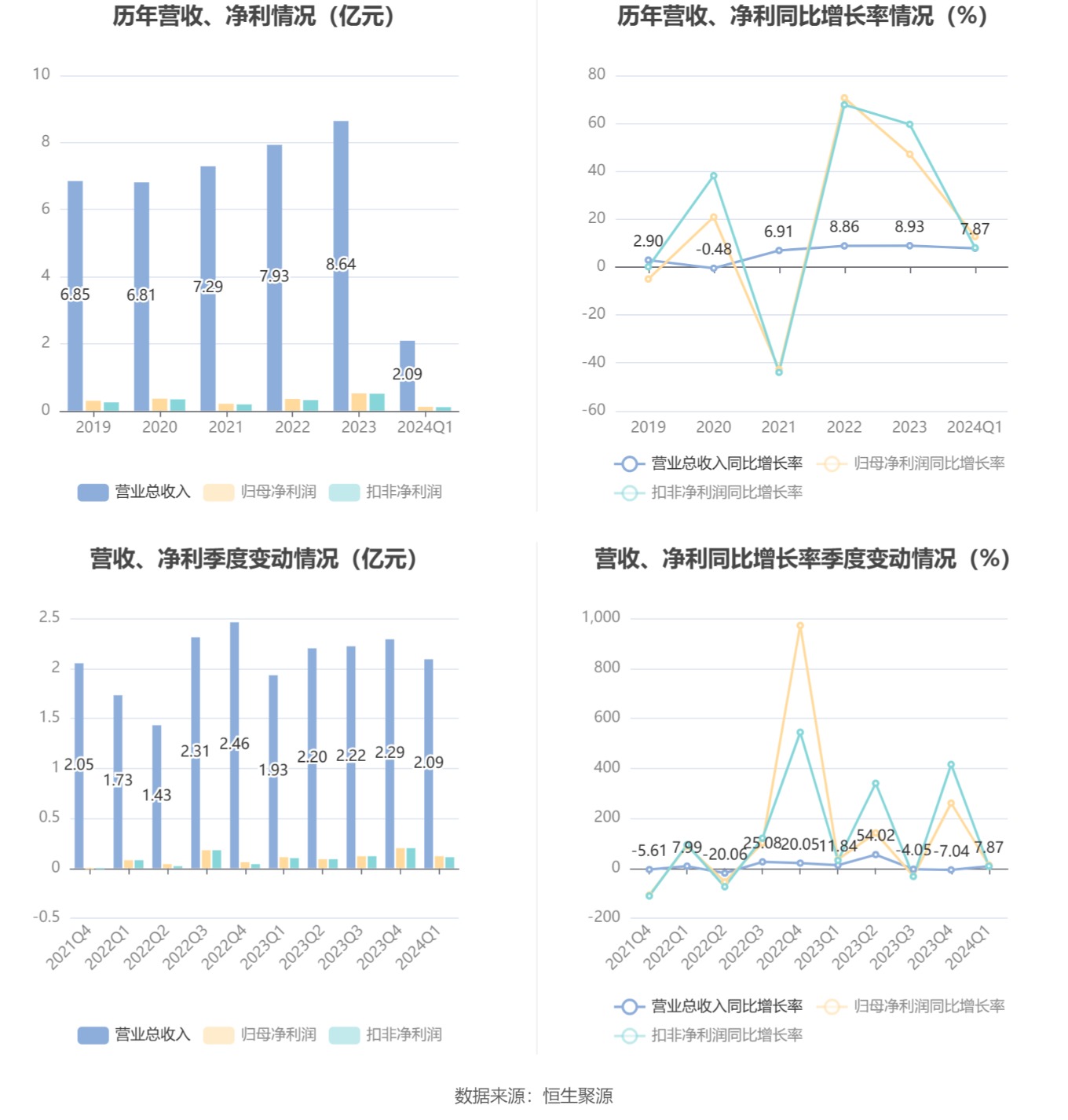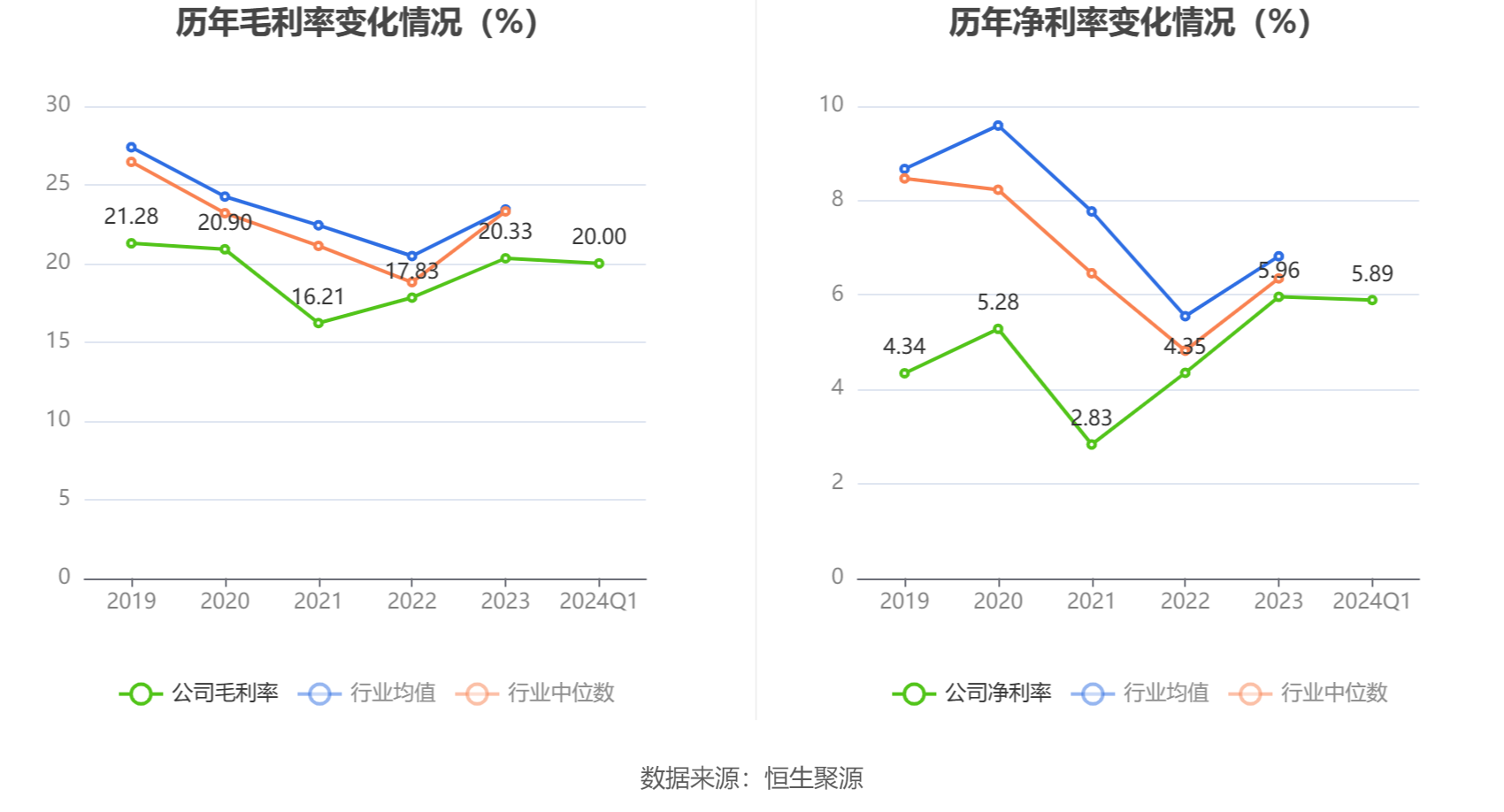 2024年第一季度,公司毛利率为20.00%,同比下降0.73个百分点;净利率为5.89%,较上年同期上升0.32个百分点。