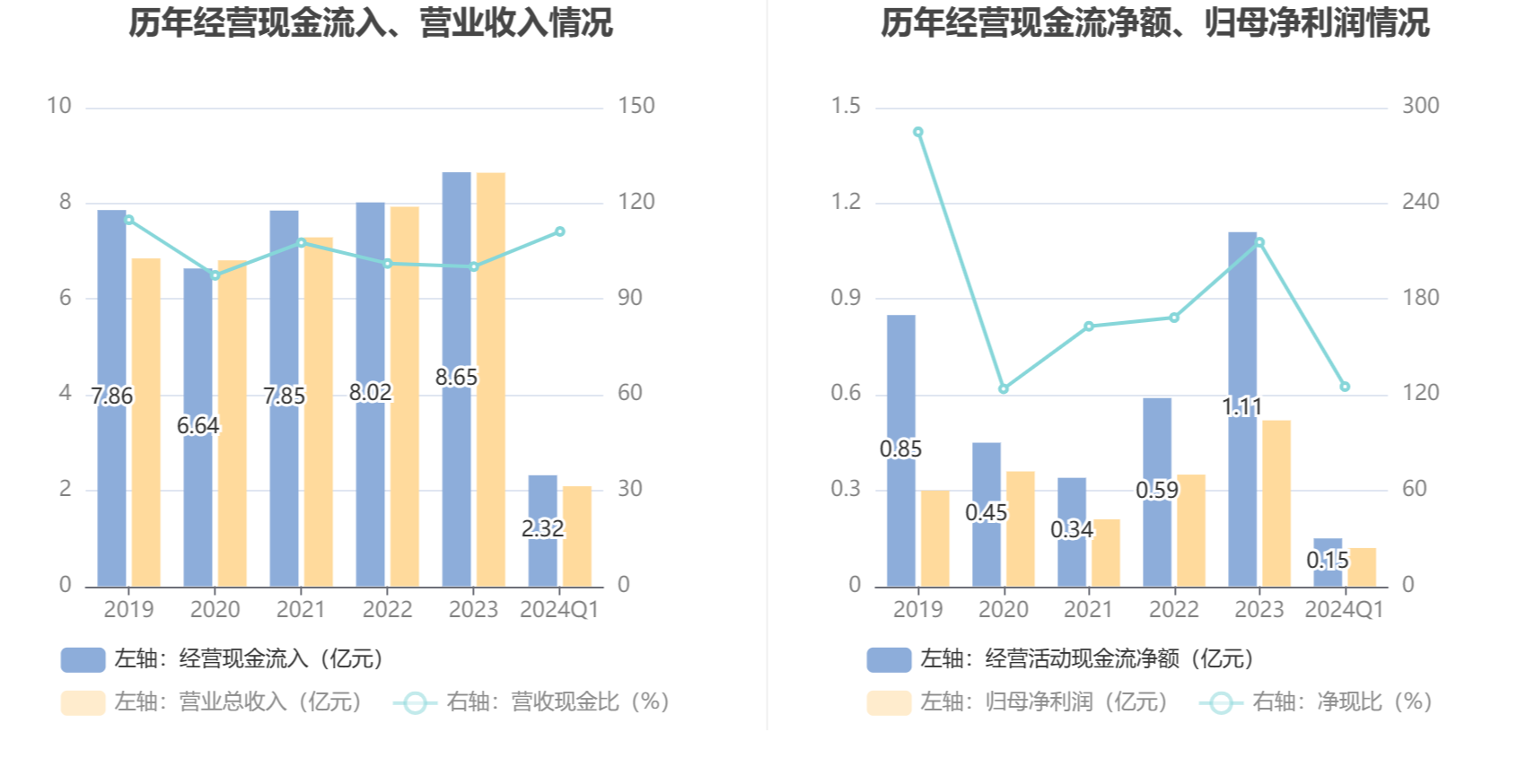 2024年第一季度,公司营业收入现金比为111.19%,净现比为125.13%。