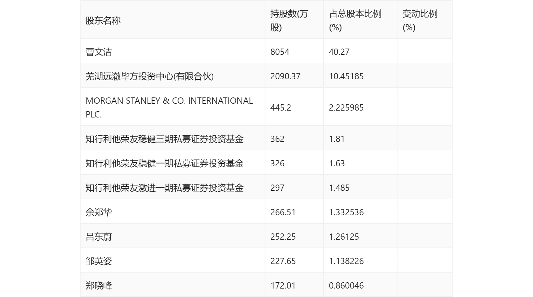 一季报显示,2024年一季度末公司十大流通股东中,新进股东为余郑华、郑晓峰,取代了上年末的许艺馨、邵爱娟。在具体持股比例上,吕东蔚、邹英姿持股有所上升,MORGAN STANLEY & CO. INTERNATIONAL PLC.、知行利他荣友稳健一期私募证券投资基金、知行利他荣友激进一期私募证券投资基金持股有所下降。