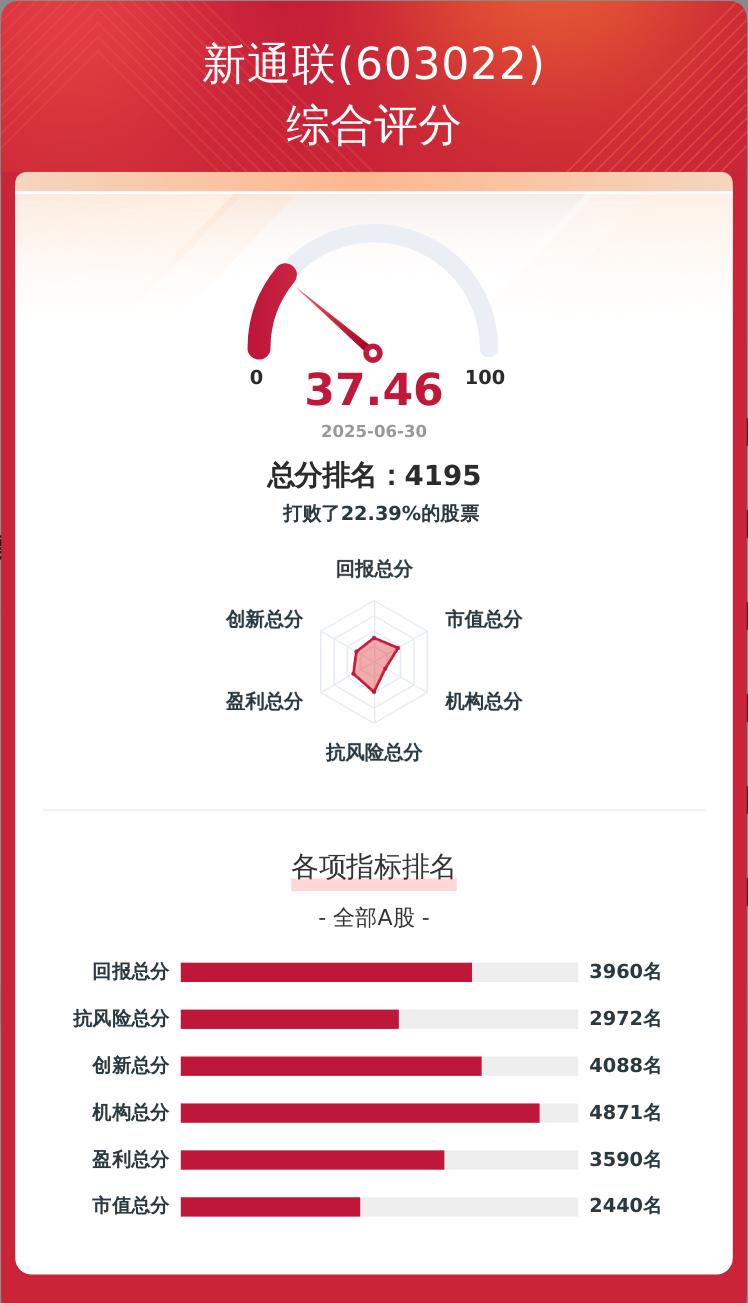 金融界上市公司研究院构建了一套上市公司韧性评价体系,从企业盈利、科技创新、股东回报、经营抗风险、市值表现及机构吸引力六个维度对企业进行量化评分,满分为100分。新通联的韧性评价总分为37.46分,在A股5405家可比上市公司中排名第4195位。