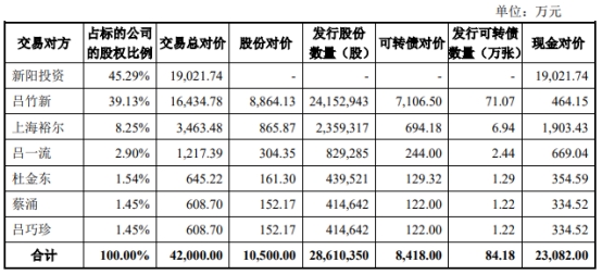 此次交易对方新阳投资、吕竹新、上海裕尔、吕一流、杜金东、蔡涌、吕巧珍作为补偿义务人,补偿义务人承诺标的公司在2022年度、2023年度、2024年度归属于母公司所有者的净利润分别不低于4000万元、5000万元、6000万元,三年累计归属于母公司所有者的净利润之和不低于1.50亿元。净利润均以扣除非经常性损益前后较低者为计算依据。