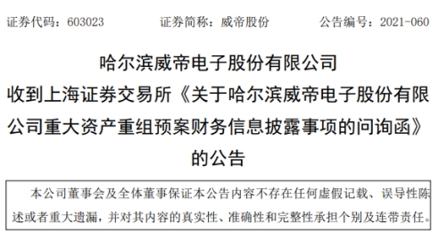 今日,威帝股份(603023.SH)发布公告称,公司于昨日收到上交所下发的《关于哈尔滨威帝电子股份有限公司重大资产重组预案财务信息披露事项的问询函》。