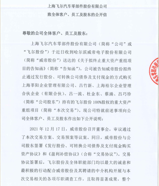面对突如其来的“流产”消息,被收购标的公司上海飞尔汽车零部件股份有限公司(下称“飞尔股份”)反应强烈。6月22日,飞尔股份在其官网发布《致全体客户、员工及股东的公开信》,称“对威帝股份所述终止理由表示难以理解且无法接受,就威帝股份公然违反交易协议约定及诚实信用原则的不正当行为提出严正抗议。”