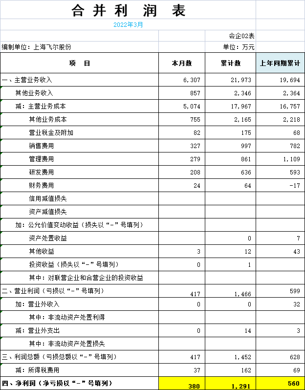 飞尔股份提供的合并利润表显示,今年1-3月,公司合并范围内累积实现主营业务收入约2.1亿元,较上年同期增长约11.57%;实现净利润约1291万元,较上年同期增长约131%(前述数据均为未经审计数据)。