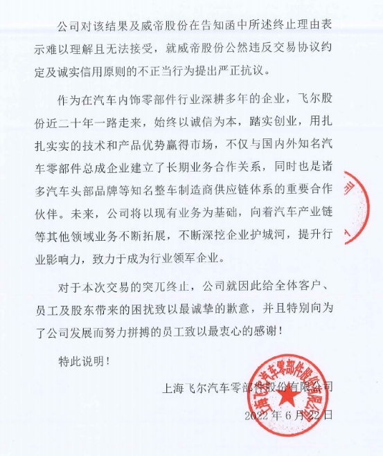 据悉,2022年6月22日,上海飞尔汽车零部件股份有限公司(以下简称:飞尔股份)在其官网上发布《致全体客户、员工及股东的公开信》,其表示“对威帝股份所述终止理由表示难以理解且无法接受,就威帝股份公然违反交易协议约定及诚实信用原则的不正当行为提出严正抗议。”