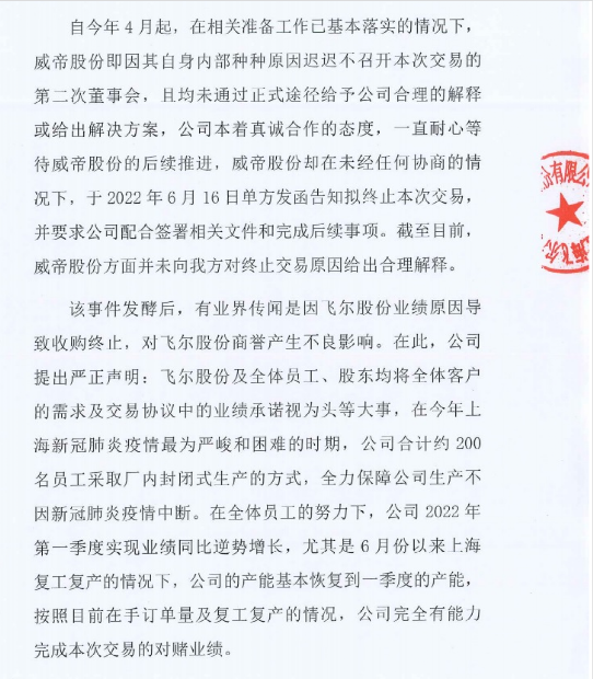 不过,按照飞尔股份公开信中的说法,自2022年4月起,在相关准备工作已基本落实的情况下,威帝股份即因其自身内部种种原因迟迟不召开本次交易的第二次董事会,且均未通过正式途径给公司合理的解释或给出解决方案。飞尔股份称,威帝股份在未经任何协商的情况下,2022年6月16日单方发函告知拟终止本次交易,要求公司配合签署相关文件和完成后续事项。截至公告发出,威帝股份未向公司就终止交易原因给出合理解释。