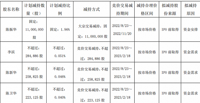 威帝股份8月1日公告,第一大股东、董事、副总经理陈振华计划通过大宗交易方式减持其所持有的公司股份1100万股,占公司总股本的1.96%,通过大宗交易方式减持的,拟减持股份总数不超过公司总股本的2%。陈振华一致行动人李滨、陈新华、陈卫华计划通过竞价交易方式减持,李滨减持其所持公司股份不超过284,886股,占公司总股本比例为0.051%;陈新华减持其所持公司股份不超过258,825股,占公司总股本比例为0.046%;陈卫华减持其所持公司股份不超过223,125股,占公司总股本比例为0.040%,通过集中竞价方式减持的,以上股东拟减持股份总数不超过其所持股份总数的25%,拟减持股份总数不超过公司总股本的1%。上述4名股东拟合计减持不超1176.6836万股,占公司总股本比例为2.097%。