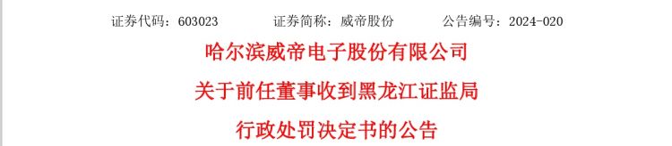 威帝股份(603023)4月9日晚间公告,因在限制期买卖公司股票,根公司前任董事陈振华收到黑龙江证监局下发的《行政处罚决定书》。