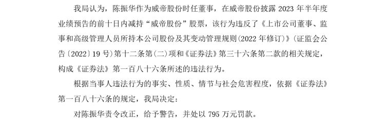 根据公告,陈振华在2023年11月3日收到中国证券监督管理委员会的《立案告知书》,因涉嫌限制期买卖威帝股份股票而被立案调查。调查结果显示,陈振华在担任威帝股份董事期间,于2023年7月7日至7月10日通过大宗交易卖出威帝股份股票,违反了《证券法》及相关规定。黑龙江证监局认定,陈振华的行为违反了《上市公司董事、监事和高级管理人员所持本公司股份及其变动管理规则(2022年修订)》第十二条第(二)项和《证券法》第三十六条第二款的规定。因此,决定对陈振华给予警告,并处以795万元人民币的罚款。