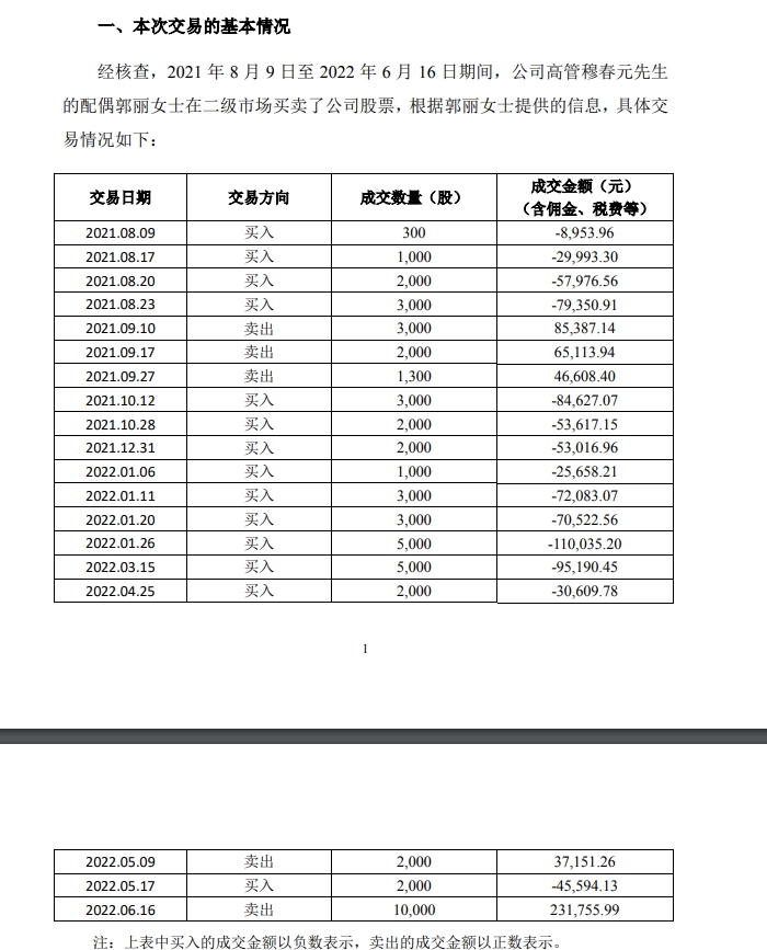 经核查,2021年8月9日至2022年6月16日期间,郭丽在二级市场买卖了公司股票。据公告披露,郭丽共进行了19笔交易。