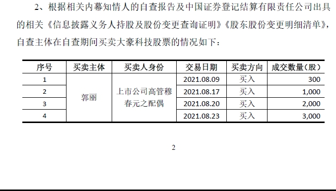 大豪科技表示,经确认,本次短线交易行为是郭丽根据二级市场的判断做出的自主投资行为,穆春元对本次短线交易并不知情,交易前后亦未告知其配偶关于公司经营情况或其他内幕信息,本次交易行为是郭丽个人操作,不存在利用内幕信息违规交易谋求利益的情形。