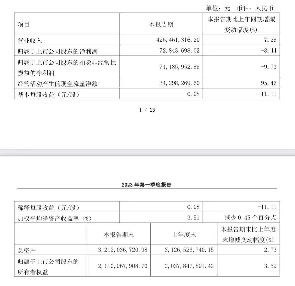 根据公告,公司实现营业收入4.26亿元,同比增长7.26%;归属于上市公司股东的净利润7284.37万元,同比减少8.44%。