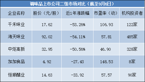 事实上,从去年12月末以来,千禾味业、海天味业和中炬高新等企业股价就已“腰斩”,加加食品、顺恒醋业跌幅相对较小,但也达到30%左右。9月6日,A股三大指数大涨,在调味品上市公司中,除中炬高新涨幅0.89%外,其余涨幅均超过2%,其中加加食品涨幅3.36%。