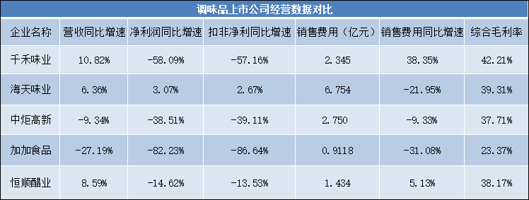 抛开行业困境,从各家调味品上市公司业绩具体来看,可谓差别巨大。其中,海天味业是唯一实现营收与净利润正增长的企业,而中炬高新(600872.SH)、加加食品营收与净利润双降,千禾味业、恒顺醋业(600305.SH)业绩则陷入“增收不增利”。