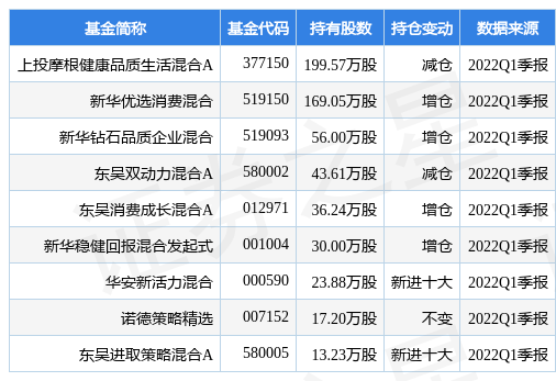 其中持有数量最多的基金为上投摩根健康品质生活混合A,目前规模为4.1亿元,最新净值3.2834(4月25日),较上一交易日下跌5.96%,近一年下跌26.14%。该基金现任基金经理为周战海徐项楠。