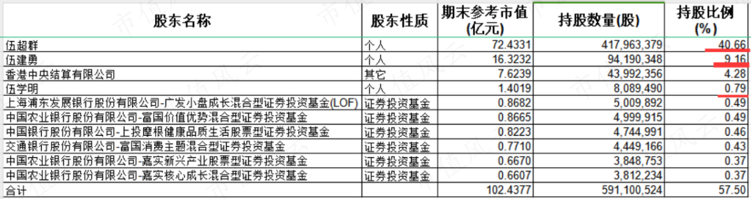 目前,伍氏家族伍超群、伍建勇和伍学明分别持股40.66%、9.16%、0.79%,合计持股50.61%。实控人伍超群是董事伍建勇的叔叔,伍超群和伍学明为兄弟关系。