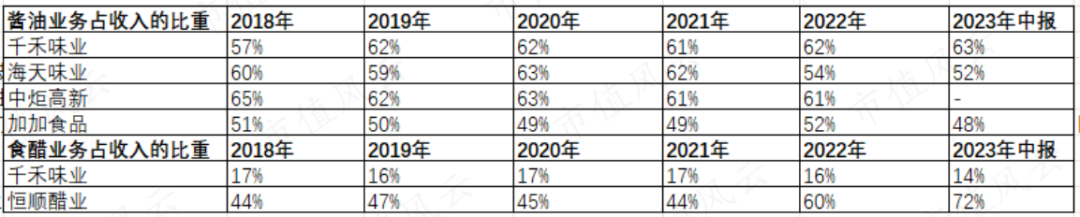 千禾味业、海天味业和中炬高新各自的酱油收入占比均在50%以上。与前三家相比,加加酱油的收入占比略低一些,接近50%。
