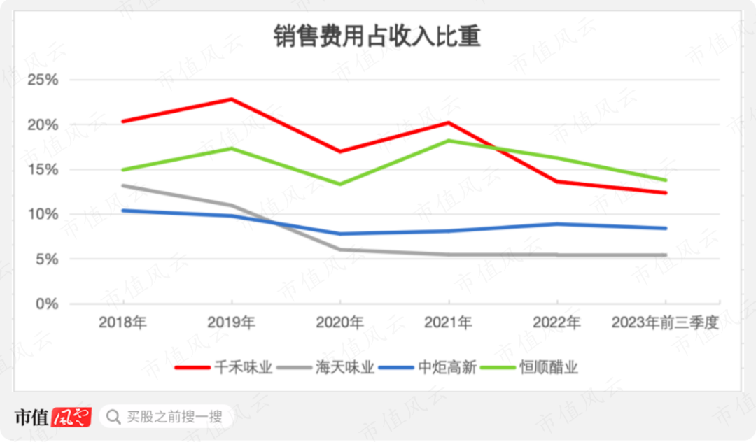 公司及同行业都采取了“经销为主+直销为辅”的模式。2022年,千禾味业、海天味业和中炬高新经销收入占比分别为68%、93%、75%,千禾味业的直销占比更高也是导致公司销售费用占比高的一大原因。