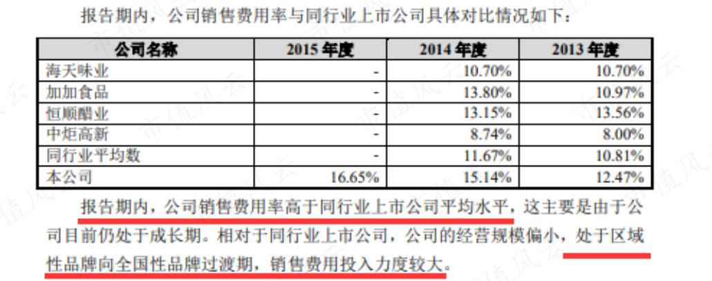 公司的销售费用占比明显高于同行业。公司曾在招股书中解释,由于公司的经营规模偏小且正处于区域性品牌到全国性品牌的过渡期,所以投入力度较大。