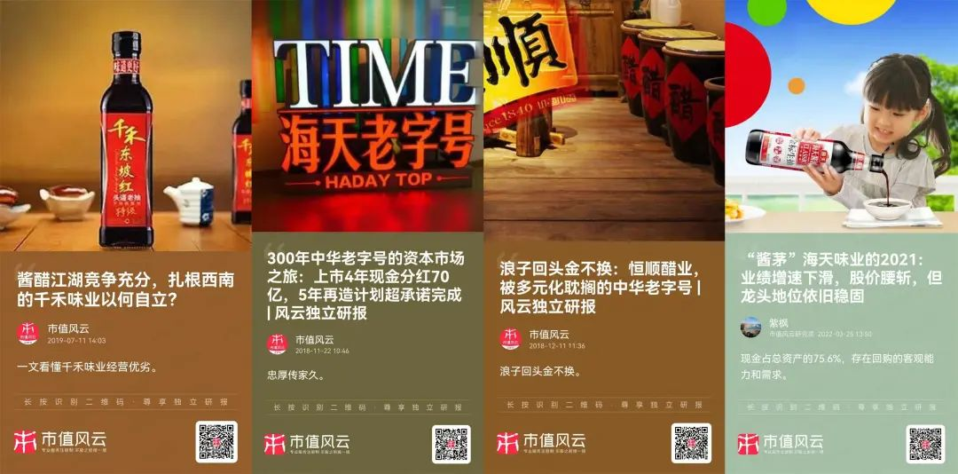 风云君曾对千禾味业、海天味业和恒顺醋业进行过深度分析,对中炬高新也有覆盖,非常值得一读,友友们可以在市值风云APP直接搜索查看。