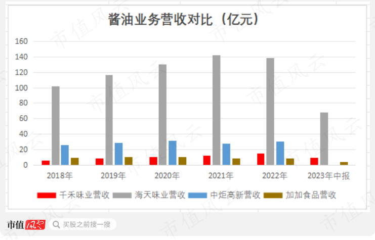 总体营收规模上,海天味业仍遥遥领先,中炬高新稳居第二。