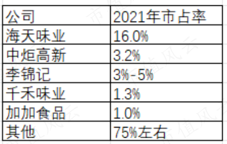 在细分的酱油业务上,根据Euromonitor,2021年我国酱油市场规模为888.95亿元。风云君以此测算2021年公司及同行业的市占率。