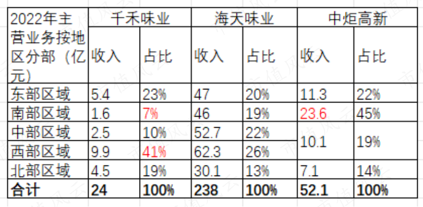 从各公司在不同地区的业务分布来看,海天已经是一个全国性的品牌,中炬高新算是有着自身成熟市场的“半全国化”品牌。