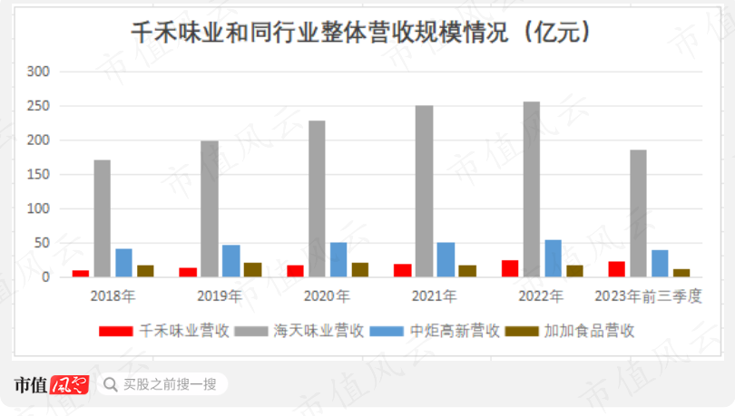 从2021年开始,千禾味业开始超越加加食品。今年三季报披露,公司前三季度营收23.31亿元,较以前年度,与中炬高新的差距明显缩小。