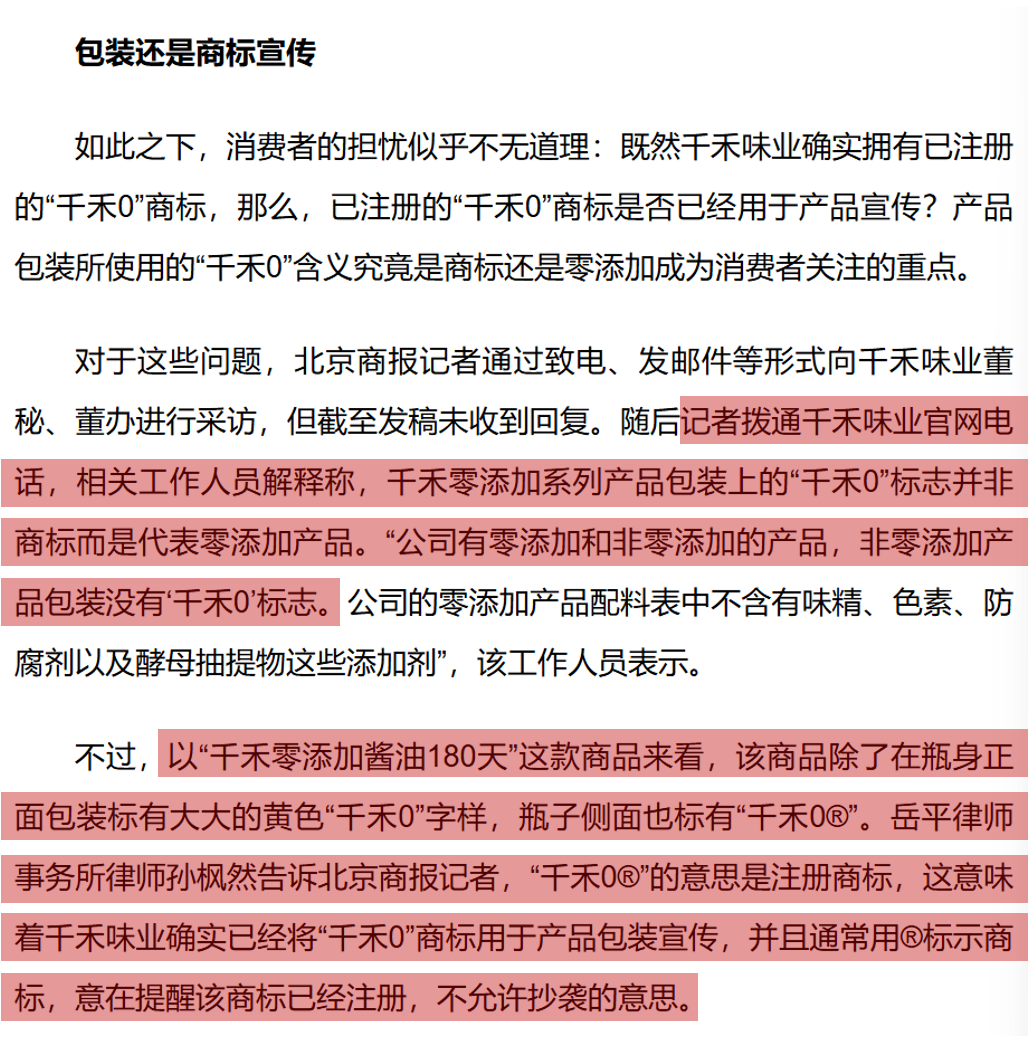 基于以上报道可以得出结论:千禾味业官方持续否认“千禾0”为商标的行为,明显与事实不符。
