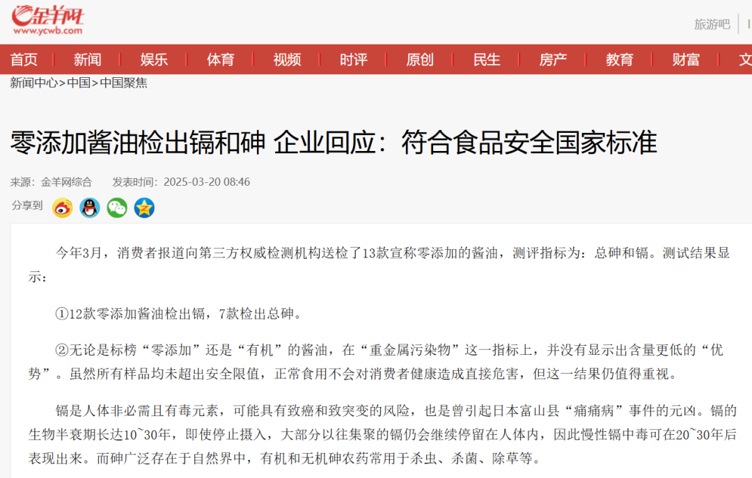 金羊网:零添加酱油检出镉和砷企业回应:符合食品安全国家标准