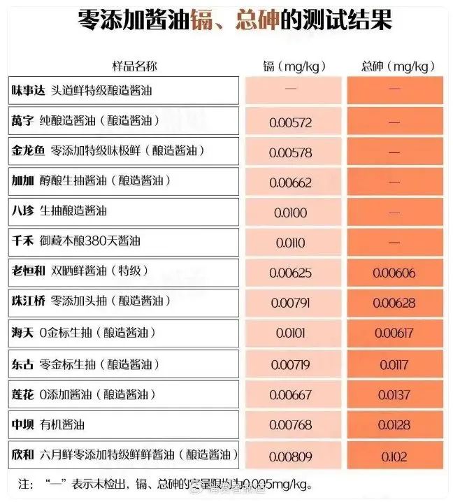 今年3月,《消费者报道》杂志向第三方权威检测机构送检了13款宣称零添加的酱油,测评指标为总砷和镉。