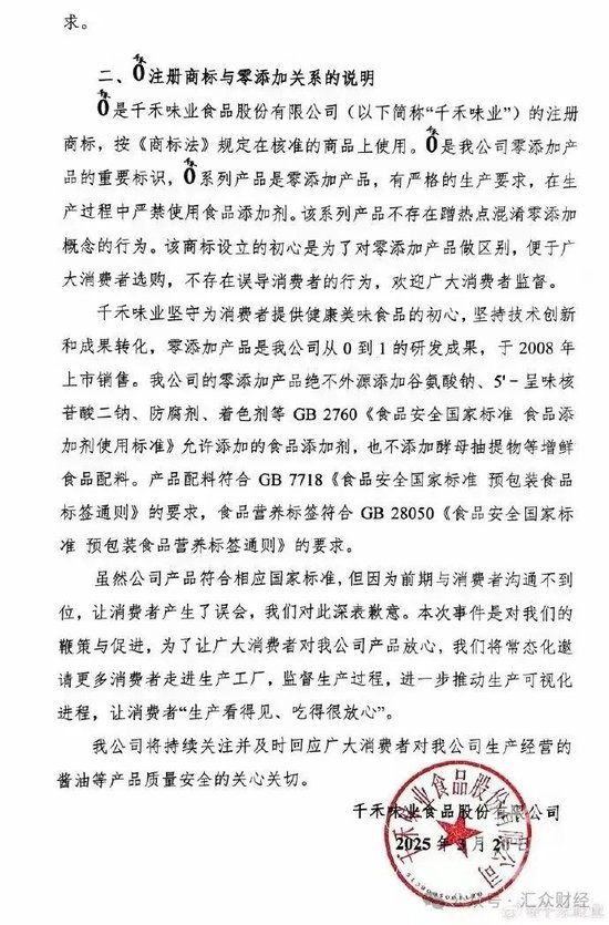 千禾0是千禾味业食品股份有限公司(以下简称“千禾味业”)的注册商标,按《商标法》规定在核准的商品上使用。千禾0是我公司零添加产品的重要标识,千禾0系列产品是零添加产品,有严格的生产要求,在生产过程中严禁使用食品添加剂。该系列产品不存在蹭热点混淆零添加概念的行为。该商标设立的初心是为了对零添加产品做区别,便于广大消费者选购,不存在误导消费者的行为,欢迎广大消费者监督。