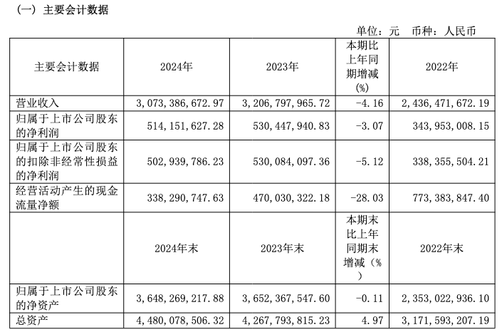 4月15日晚,调味品龙头企业千禾味业(603027)发布2024年年度报告,2024年公司实现营业收入30.73亿元,同比下降4.16%,实现归属净利润5.14亿元,同比下降3.07%;经营活动产生的现金流量净额为3.38亿元,同比下降28.03%。基本每股收益0.5015元。拟每10股分配现金5元(含税)。