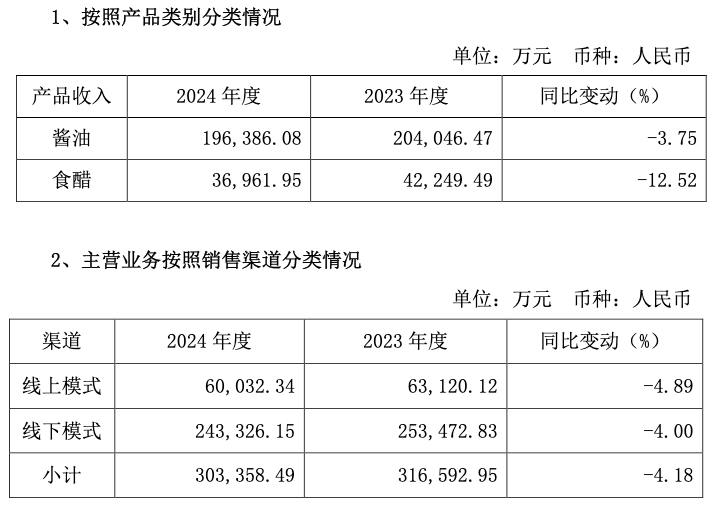 分产品看,2024年公司酱油、食醋分别实现营业收入19.64亿元、3.70亿元,同比分别下降3.75%、12.52%。从销售渠道看,公司线上和线下模式收入分别跌4.89%、4.0%。分地区看,除南部区域外,其他区域营业收入均有所下降。